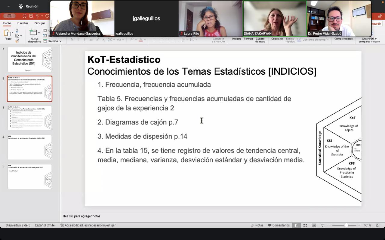 La dinámica, que combinó trabajo colaborativo y discusión académica, puso en evidencia la riqueza de las producciones estudiantiles como insumo para caracterizar el conocimiento docente especializado. Según el Dr. Vidal-Szabó, “este ejercicio nos permite avanzar en la comprensión del modelo STSK, mostrando cómo los futuros profesores comienzan a desarrollar competencias esenciales para enseñar estadística de manera crítica y significativa”.